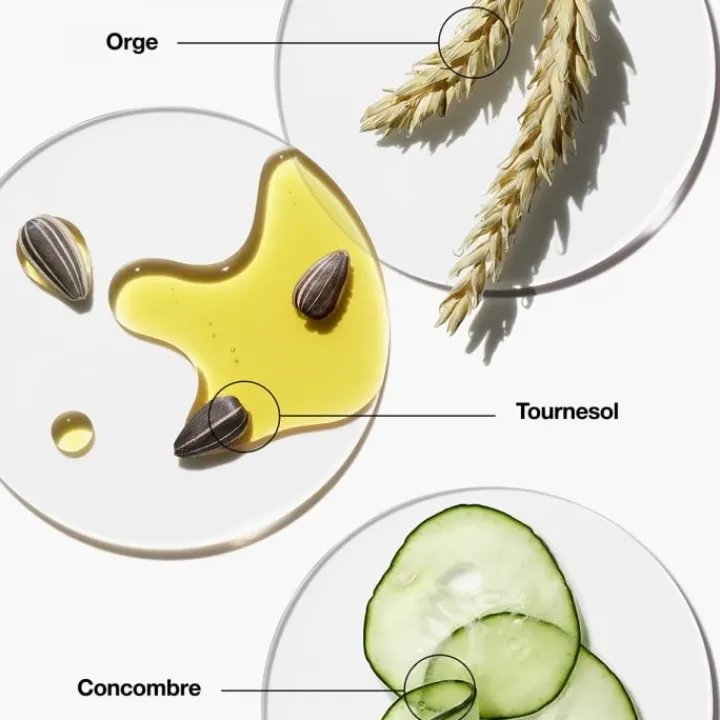 - 3 pro-lipides : un mélange d’extraits d’orge, de tournesol et de concombre pour hydrater et équilibrer la barrière cutanée.