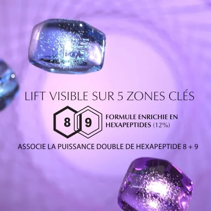 Enrichi en Acetyl Hexapeptides 8 + 9, qui sculptent visiblement le visage et estompent l’apparence des rides et des ridules.