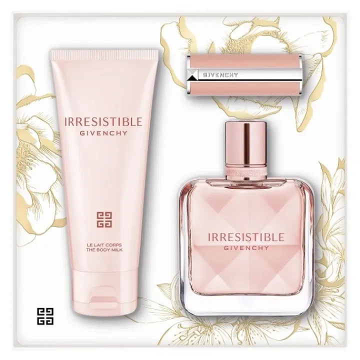 Ce coffret comprend une Eau de Parfum Irresistible Givenchy 50 ml, une lotion pour le corps 75 ml et un mini rouge à lèvres Rose Perfecto N001 Pink Irresistible.