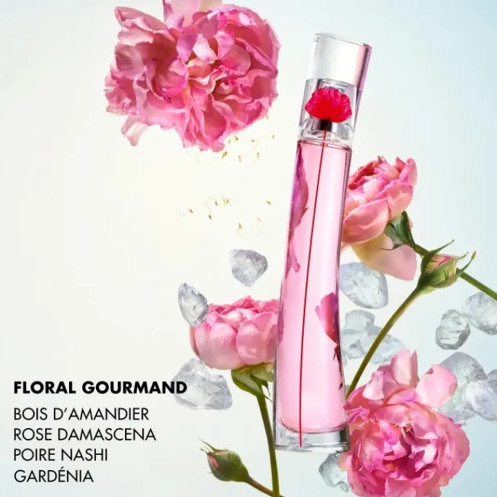 Élaborée sur une base boisée, l’eau de parfum Flower By Kenzo Poppy Bouquet Kenzo se fait plus enveloppante que son ainé. Au sein de sa partition, les fleurs s’offrent en bouquet pour afficher un côté plus généreux qu’autrefois. Confectionné par Alberto Morillas et Dora Baghriche, ce floral boisé débute par les accords frais et juteux de la poire nashi, un fruit qui résonne comme un hommage aux origines japonaises de la maison Kenzo. Le cœur se fait plus sensuel et voluptueux avec la présence de la rose Bulgare et du gardénia, auxquels vient se mêler la luminosité du jasmin. Ce parfum femme Kenzo dévoile enfin un sillage à la fois intense et moderne avec les tonalités crémeuses du bois d’amandier.