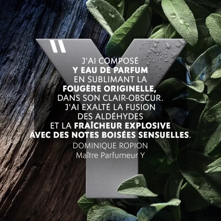 L’Eau de parfum pour Homme. Une fougère claire obscure intense et sensuelle. L’éclat puissant de la sauge & de l’absolu de géranium est magnifié par l’intensité addictive des bois sensuels & l’élégance de la fève tonka. « Y revisite avec audace un grand classique, les effluves de fougère. » Dominique ROPION, créateur du parfum.