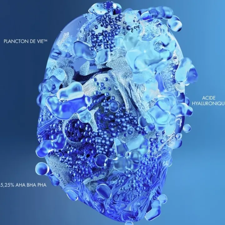 -le Plancton de Vie™ régénérant et booster d’efficacité associé à 5 % AHA+BHA+PHA : un trio d’acides qui agit en surface et en profondeur, resurfaçant pour une peau d’apparence saine, plus lisse et plus lumineuse.