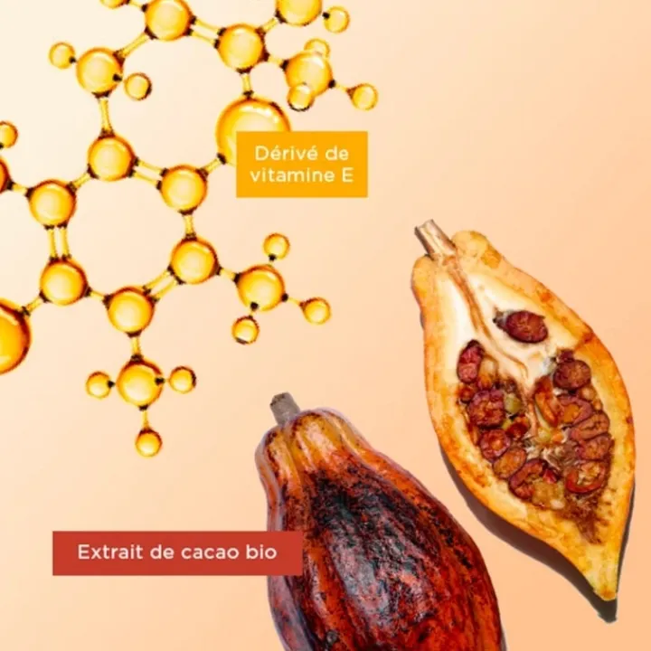 - Extrait de cacao bio : double action anti-âge et hydratante renforcée. Il aide à booster la synthèse de collagène et la synthèse d’acide hyaluronique pour une peau intensément hydratée.
