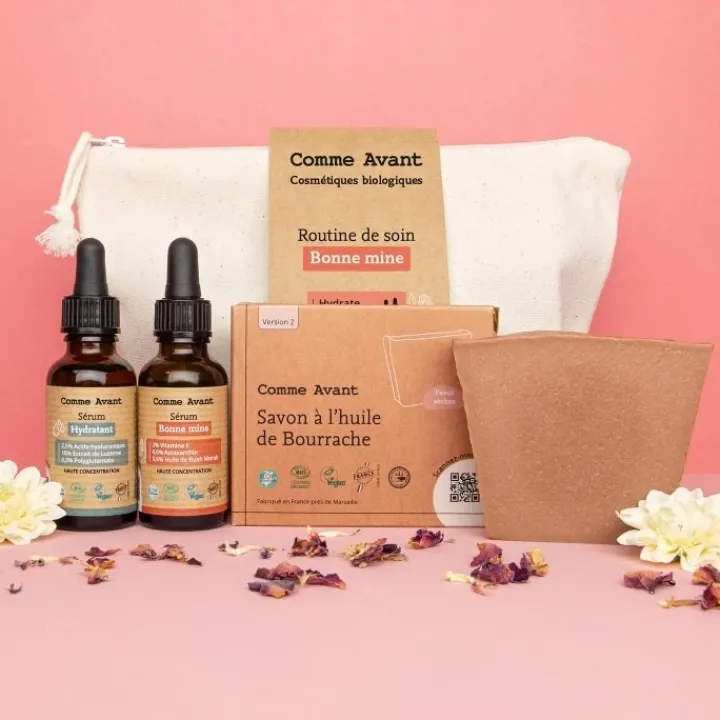 Le coffret de routine de soin bonne mine contient 3 produits Comme Avant, 100% d’origine naturelle pour vous accompagner au quotidien :