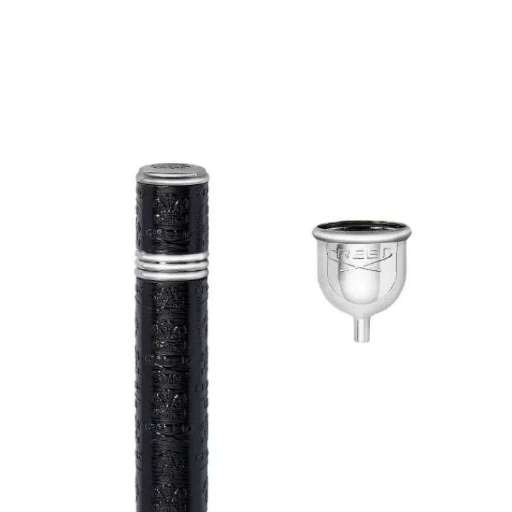Séduisant par son élégance traditionnelle, ce vaporisateur cylindrique Creed de 10 ml magnifié de finitions argentées est protégé par un étui au cuir noir embossé.