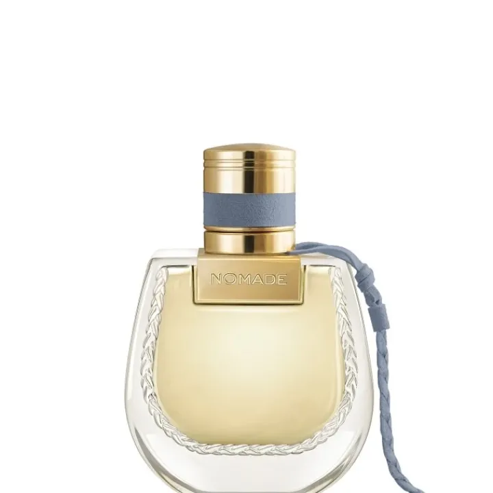 L’emblématique flacon Nomade est rehaussé de touches dorées, tandis que son nœud se réinvente dans une teinte bleu gris.
