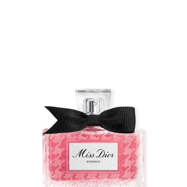 Miss Dior Essence s’affirme tout en renouant avec son identité originelle, réinterprétant le flacon patrimoine imaginé en 1948 par Christian Dior : un motif pied-de-poule givré ainsi qu’un nœud poignard de gros grain noir fabriqué en France, qui habille une précieuse coiffe en verre.