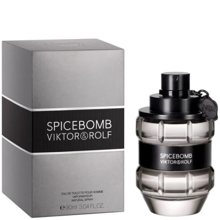 Retrouvez Spicebomb Viktor&Rolf dans un flacon facetté en forme de grenade grise argentée. Un bandeau central noir brillant vient élégamment ceinturer la bouteille, alors que le sceau de Viktor&Rolf, accroché au spray, fait office de détonateur sur cette arme de séduction massive.