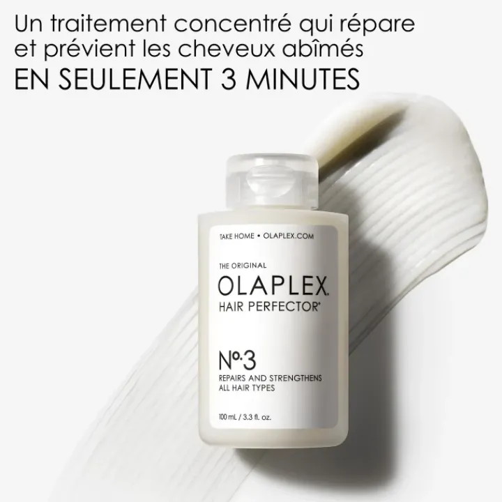 Le Nº.3 Grâce à la technologie brevetée de renforcement capillaire OLAPLEX, Hair Perfector est un soin pré-shampooing dont la capacité à réparer et renforcer les cheveux de l’intérieur vers l’extérieur a été prouvée.